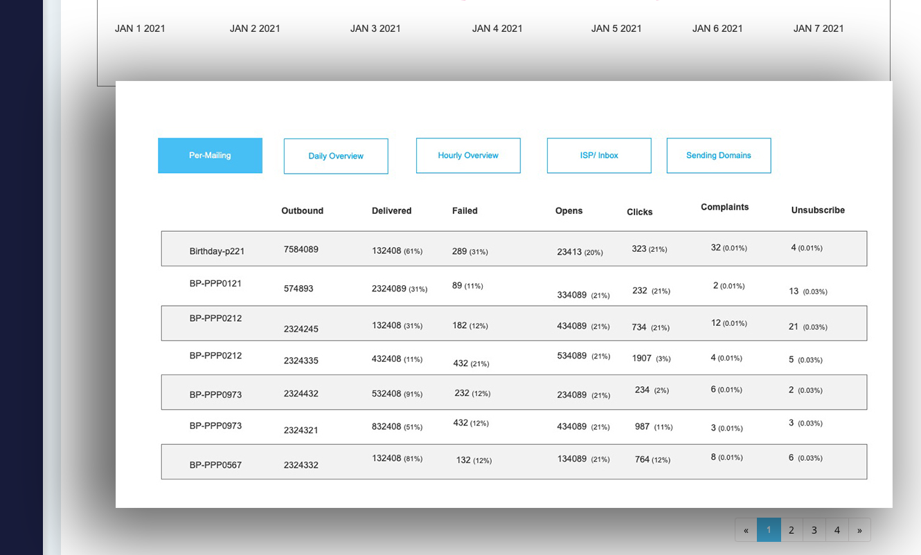 The performance table provides a detailed breakdown of each mailing, including delivery rates, failures, opens, clicks, complaints, and unsubscribes. With filtering options by day, hour, ISP, or sending domain, users can drill into specific segments to identify trends and issues. By surfacing both engagement and deliverability metrics side by side, the table empowers users to measure campaign effectiveness, troubleshoot problems, and make data-driven improvements.