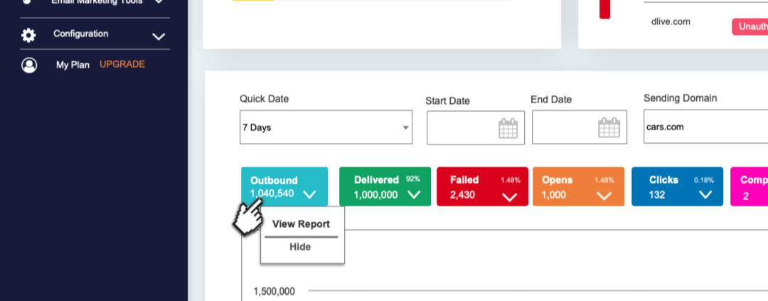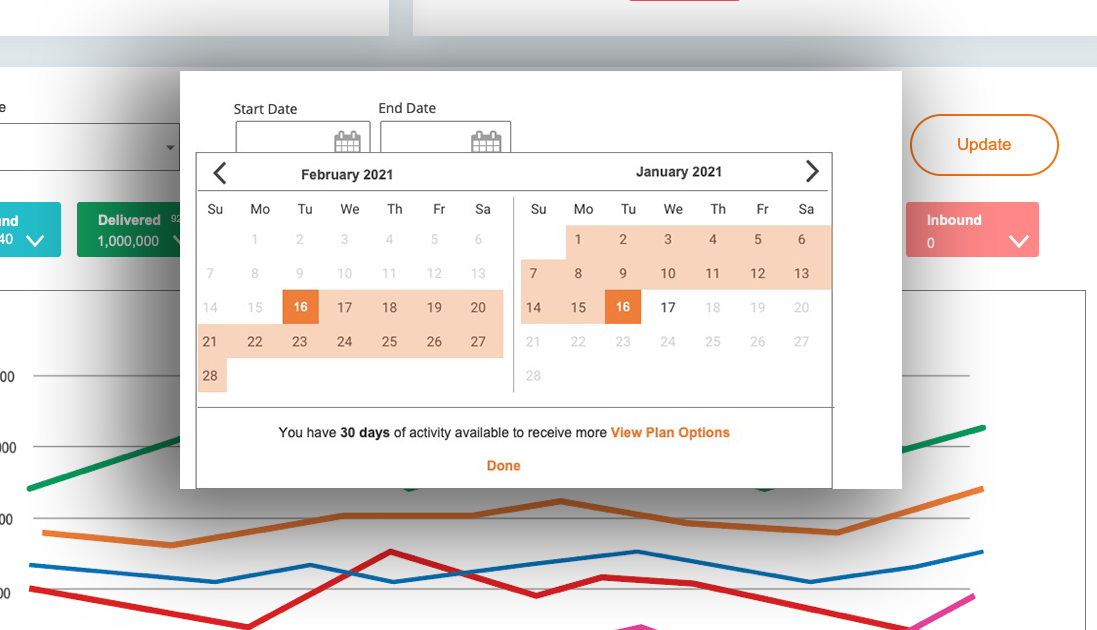 This component lets users define a start and end date to view engagement metrics—such as clicks, opens, and deliveries—within a chosen timeframe. By adjusting the range, users can analyze short-term campaign results or long-term trends, making it easier to measure impact, compare performance, and optimize future sends.