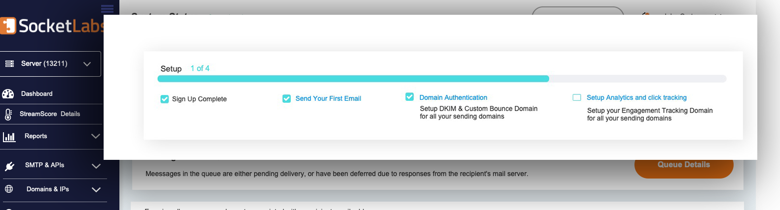 The status bar gives users a clear view of their onboarding progress across four key steps: signing up, sending a first email, setting up authentication, and enabling click-tracking analytics. Highlighting authentication within this flow is essential, since properly configuring SPF, DKIM, and DMARC ensures better inbox placement and protects the sender’s domain reputation. By visualizing these steps together, the bar helps users track their progress, understand what’s left to complete, and build confidence that their server is fully ready for reliable sending.