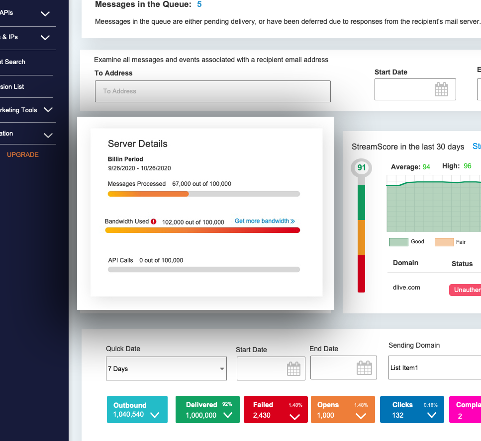 The Server Stats component surfaces critical account metrics — API calls, billing period, and bandwidth usage — each paired with an intuitive gauge. This design gives users an immediate sense of their system’s performance and resource consumption, helping them anticipate limits before they impact deliverability or incur extra costs. By turning complex usage data into simple visual gauges, the dashboard empowers users to monitor server health at a glance and take proactive action when needed.